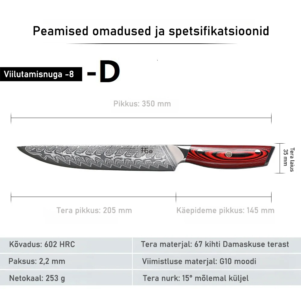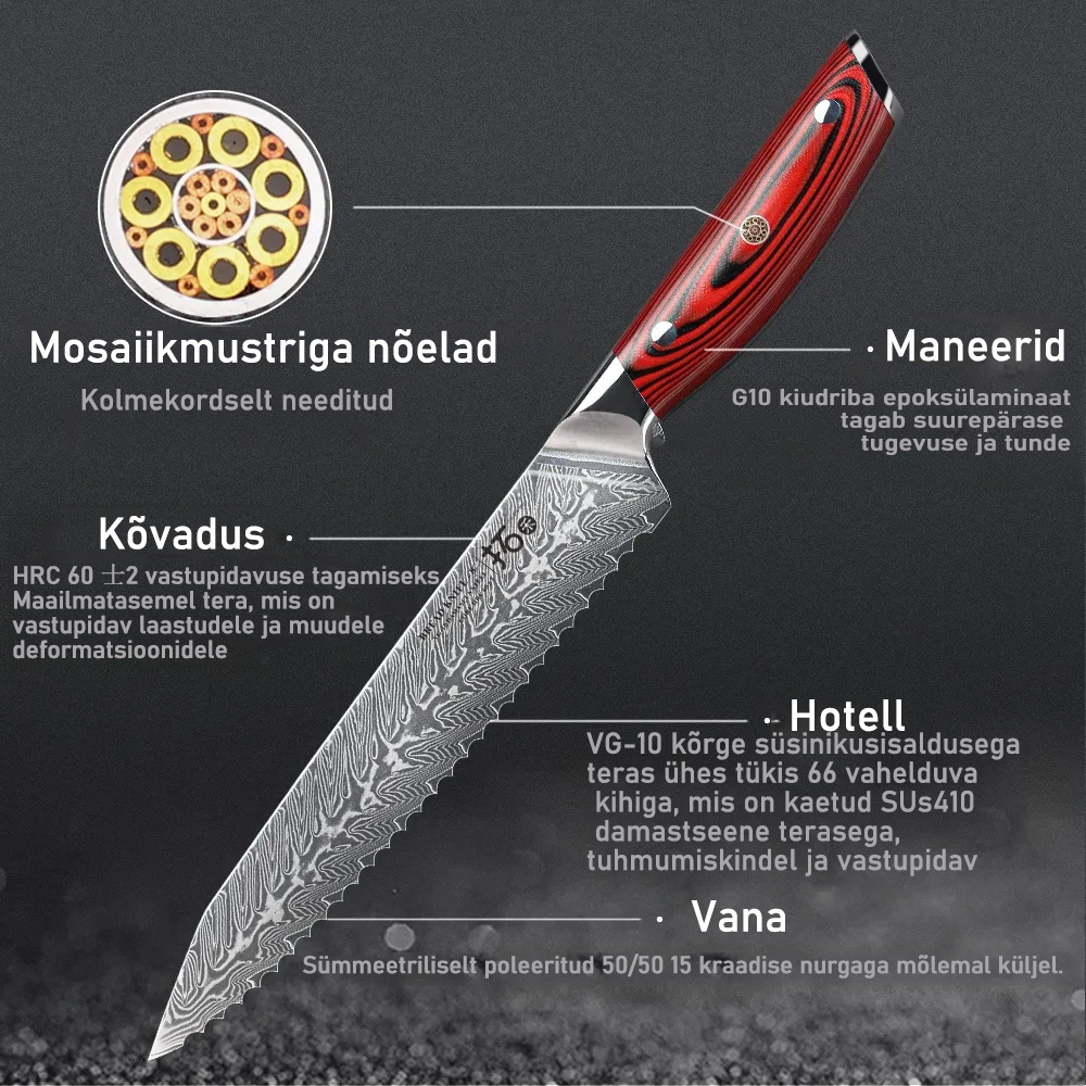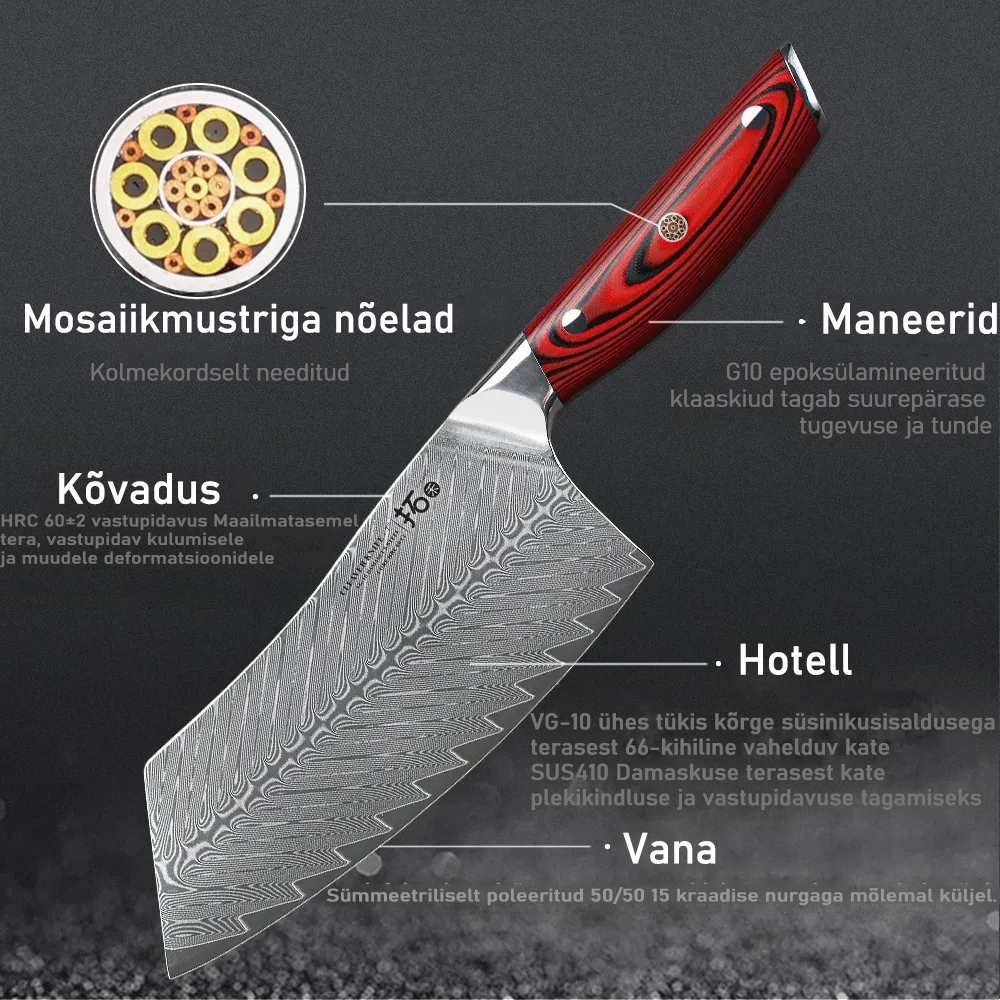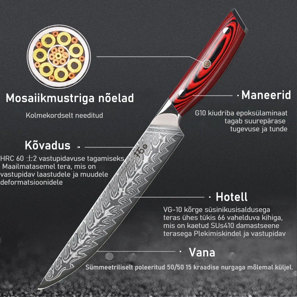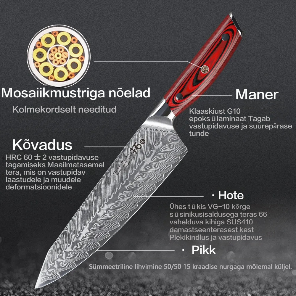 Toote materjal: Kvaliteetne Jaapani 67-kihiline Damaskuse teras ja VG-10 terasest südamikumaterjal, kvaliteetne G-10 käepide on sõjalise vastupidavusega ning ei kahane ega tuhmu. See vähendab väsimust, tuimust ja valu isegi pärast pikaajalist kasutamist.