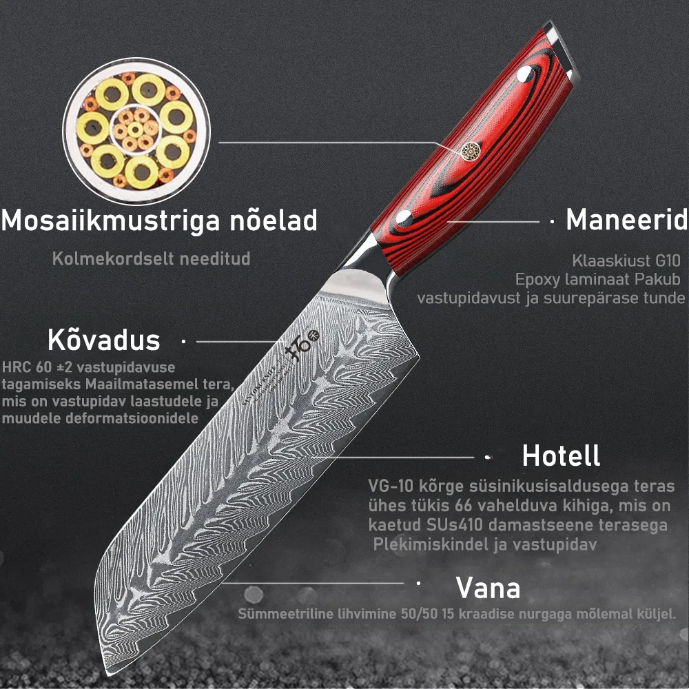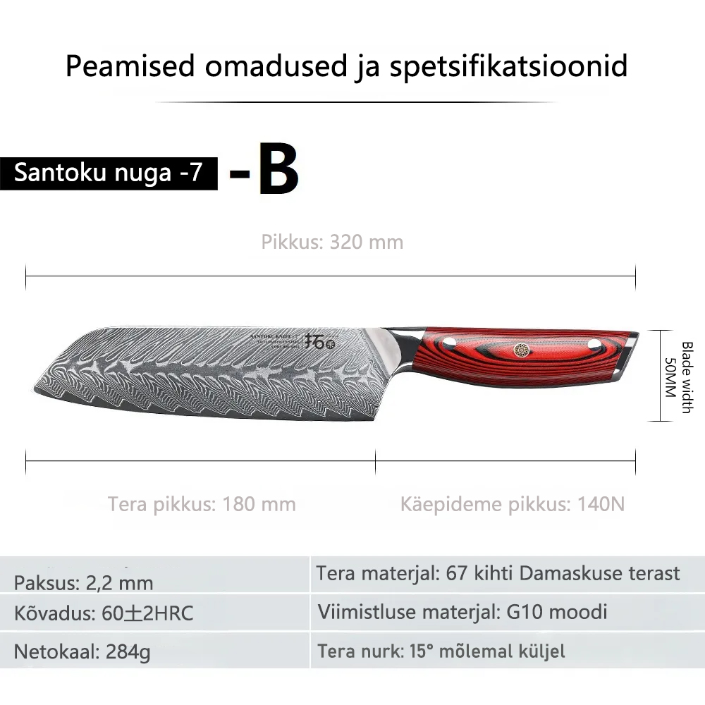 7-tolline Santoku nuga - B ( disain sobib mitmeks otstarbeks, sealhulgas viilutamiseks, viilutamiseks ja õhukeseks viilutamiseks, sellest ka nimi "Santoku nuga" )
